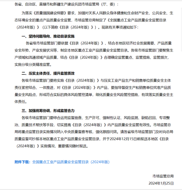 市場監管總局制定了《全國重點工業產品質量安全監管目錄(2024年版)》,目錄中兒童用品涉及46個品,包括不僅限于安撫奶嘴,兒童廚具,玩具,學生文具等;食品相關產品涉及32個品,包括不僅限于一次性可降解餐飲具,一次性竹木筷,杯壺類,奶瓶,奶嘴等。市場監管總局將重點監管目錄實施情況納入**質量督察考核,強化跟蹤問效。