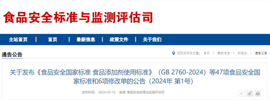 根據《食品安全法》規定,國家衛生健康委、市場監管總局聯合印發2024年第1號公告,發布47項新食品安全國家標準和6項修改單。