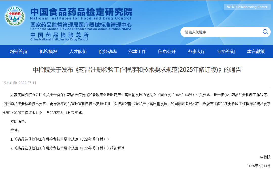 2025年7月14日,中國(guó)食品藥品檢定研究院發(fā)布《藥品注冊(cè)檢驗(yàn)工作程序和技術(shù)要求規(guī)范(2025年修訂版)》,自2025年8月1日起施行。