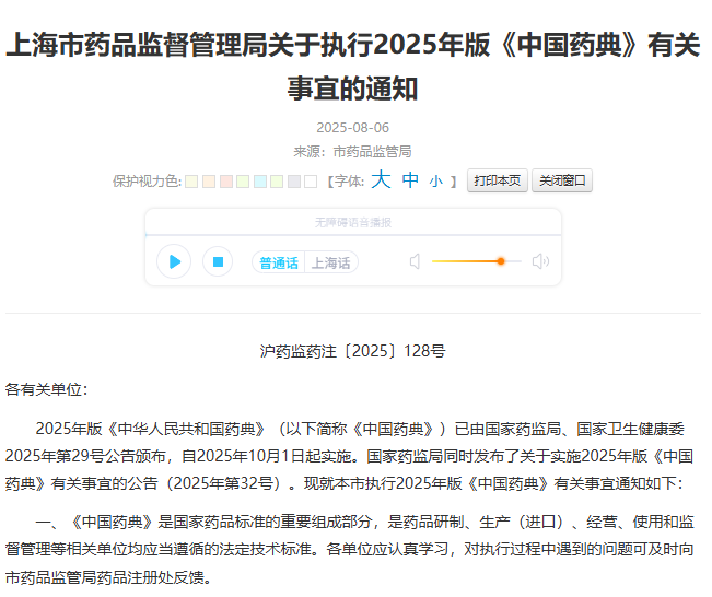 2025年版《中華人民共和國藥典》(以下簡稱《中國藥典》)已由國家藥監(jiān)局、國家衛(wèi)生健康委2025年第29號公告頒布,自2025年10月1日起實(shí)施。國家藥監(jiān)局同時發(fā)布了關(guān)于實(shí)施2025年版《中國藥典》有關(guān)事宜的公告(2025年第32號)。現(xiàn)就本市執(zhí)行2025年版《中國藥典》有關(guān)事宜通知如下: