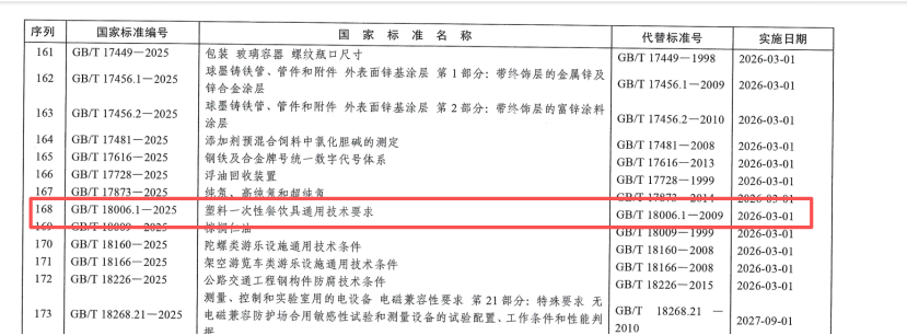 2025年8月29日,國家市場監督管理總局(國家標準化管理委員會)批準《包裝儲運圖形符號標志》等622項推薦性國家標準和6項推薦性國家標準修改單,其中包括《塑料一次性餐飲具通用技術要求》GB/T 18006.1-2025,將于2026年3月1日正式實施。