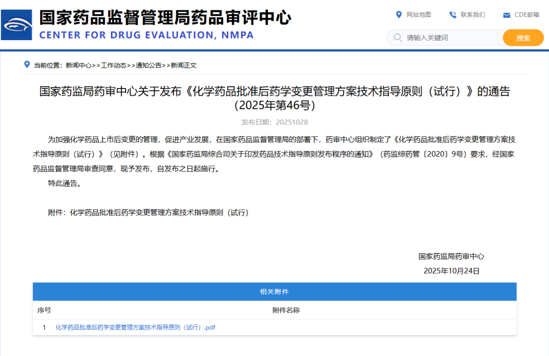 2025年10月28日,國家藥監局藥審中心關于發布《化學藥品批準后藥學變更管理方案技術指導原則(試行)》的通告(2025年第46號)。