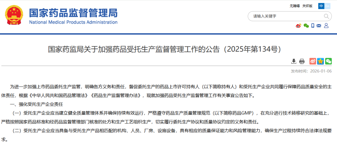 2026年01月06日,國家藥品監督管理局發布了《國家藥監局關于加強藥品受托生產監督管理工作的公告(2025年第134號)》。