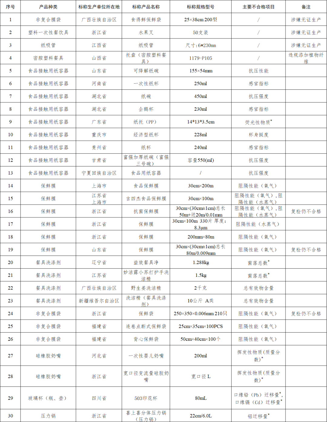 (一)監督抽查概況。本次共抽查18種產品1133批次,在上海、廣東、浙江等25個省份472家銷售單位抽查616批次產品,在廣東、浙江、山東等27個省份505家生產單位抽查517批次產品。抽查共發現30批次不合格產品,其中:違法違規產品4批次;檢驗不合格產品26批次,包括食品接觸用紙容器9批次、保鮮膜6批次、餐具洗滌劑4批次、非復合膜袋3批次、硅橡膠奶嘴2批次、玻璃杯(瓶、壺)和壓力鍋各1批次。(二)跟蹤抽查情況。跟蹤抽查到上次抽查不合格生產單位25家,其中有1家生產單位產品仍不合格。(三)拒檢情況。本次抽查中,廣東省佛山市瑪諾駿電器科技有限公司違反《中華人民共和國產品質量法》規定,無正當理由拒絕接受監督抽查。